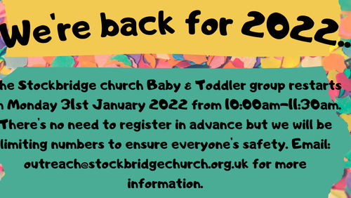 Our Baby & Toddler group restarts on Monday 31st January 2022 from 10:00am-11:30am at the church. No need to register in advance, just go down the left hand side of the church and ring the bell!
