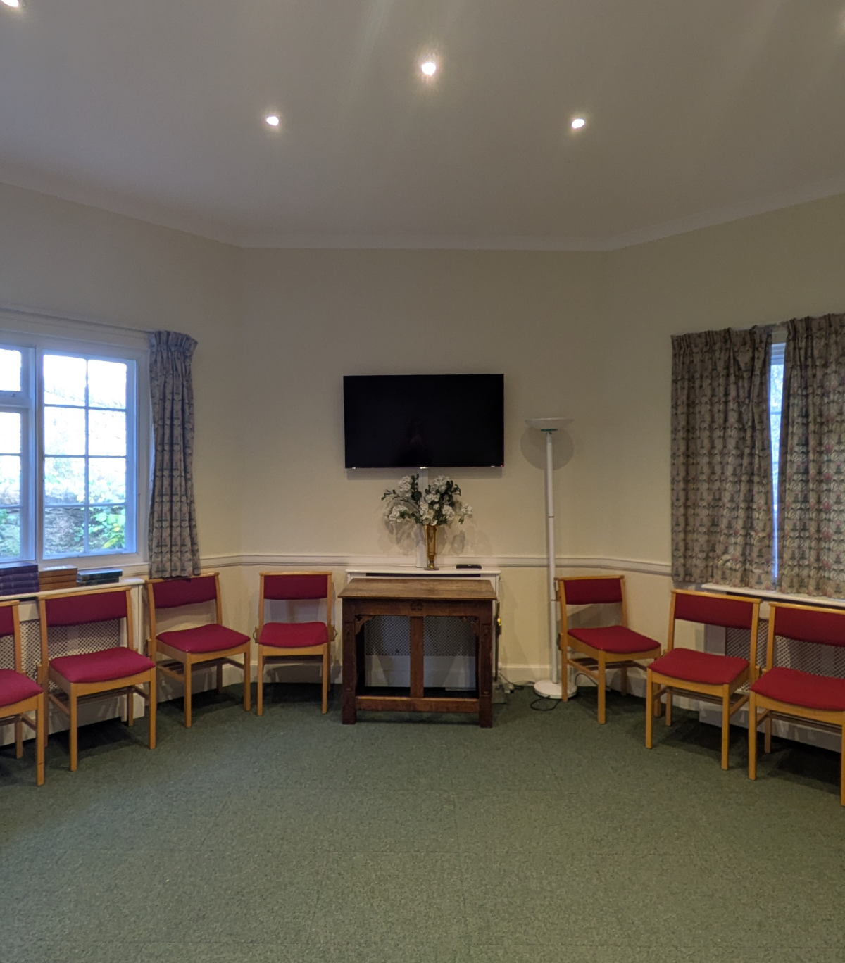 It has a TV, table, and set of chairs - so is perfect for meetings or for use as a green room.